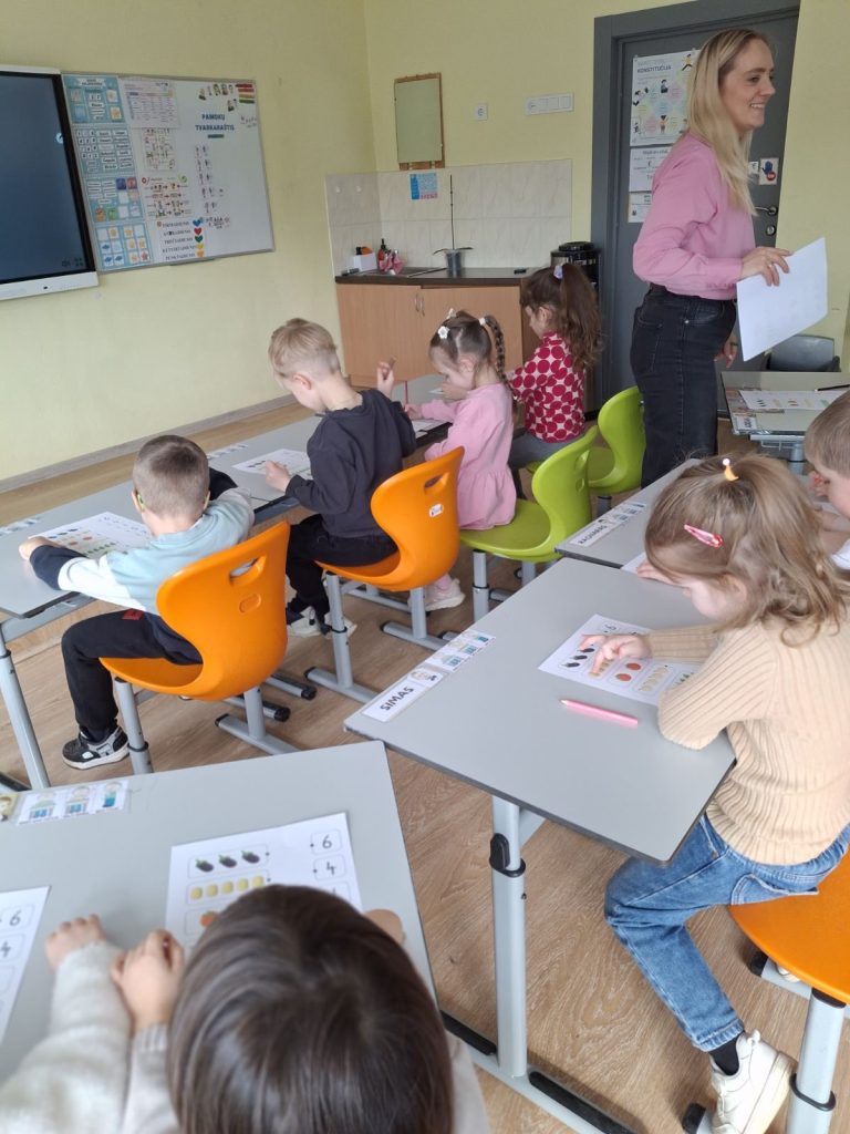 Vėliau „Kačiukai“ persikėlė į klasę, kur jų laukė tikros pamokos patirtis. Vaikai atliko įvairias užduotėles, noriai dirbo, bendradarbiavo tarpusavyje ir drąsiai išbandė mokinio vaidmenį.