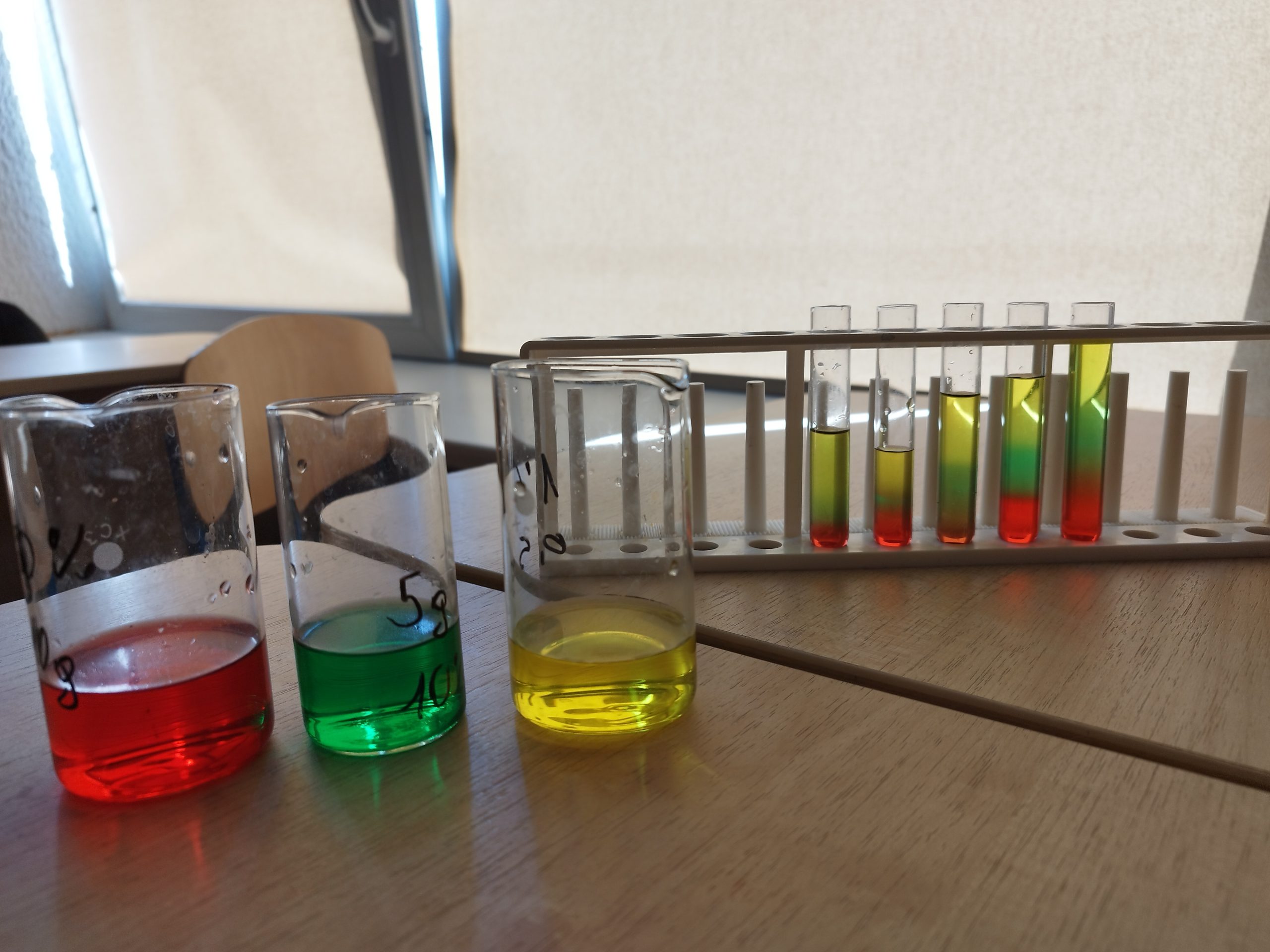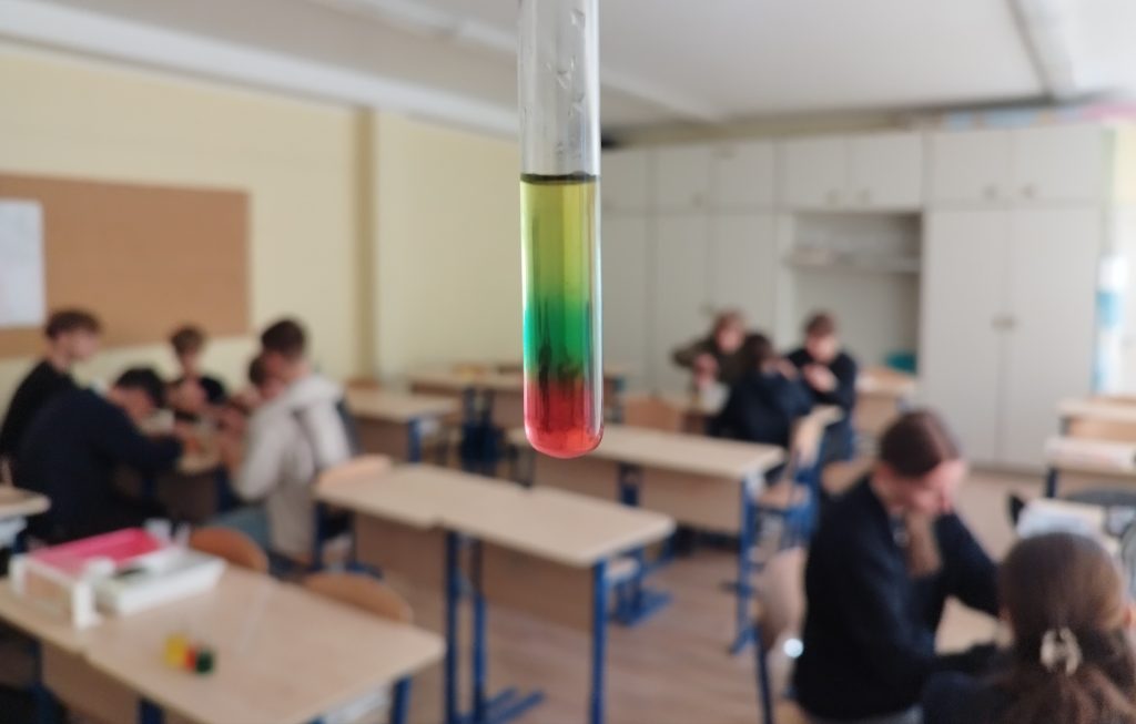 Balandžio 22d. progimnazijos 8a, 8b, 8d klasių mokiniai chemijos pamokoje mokėsi susluoksniuoti spalvotus tirpalus ir iš jų sukūrė trispalvę vėliavą mėgintuvėlyje. Išbandė, kaip paprastomis priemonėmis pasigaminti Lavos lempą. Praktinės užduotys įtraukia ir ugdo kantrybę, skatina kūrybiškumą.